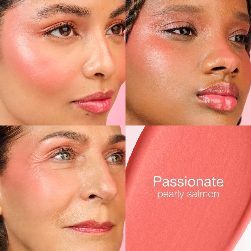 Our INFINIT-GLAM PASSIONATE is a creamy blush for lips, cheeks, and eyes. Its exclusive multifunctional formula allows giving a radiant and youthful tone to the lips, cheeks, and eyelids. It has a soft and light texture with a luminous and radiant finish. It can be mixed with other colors to achieve the desired shade. It contains 2% Hyaluronic Acid, natural pigments, and Bixa Orellana extract, which help maintain the natural beauty of the skin, revealing it firm, hydrated, and young. Buildable color intensity.